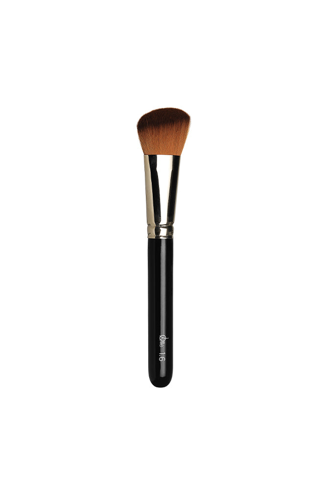 Brocha para la aplicación de rubor. Tiene forma angular su férula es de latón niquelado y su mango de madera lacrada en negro. Material de cerdas sintéticas extra fina, lo que aporta suavidad a la hora de la aplicación.
